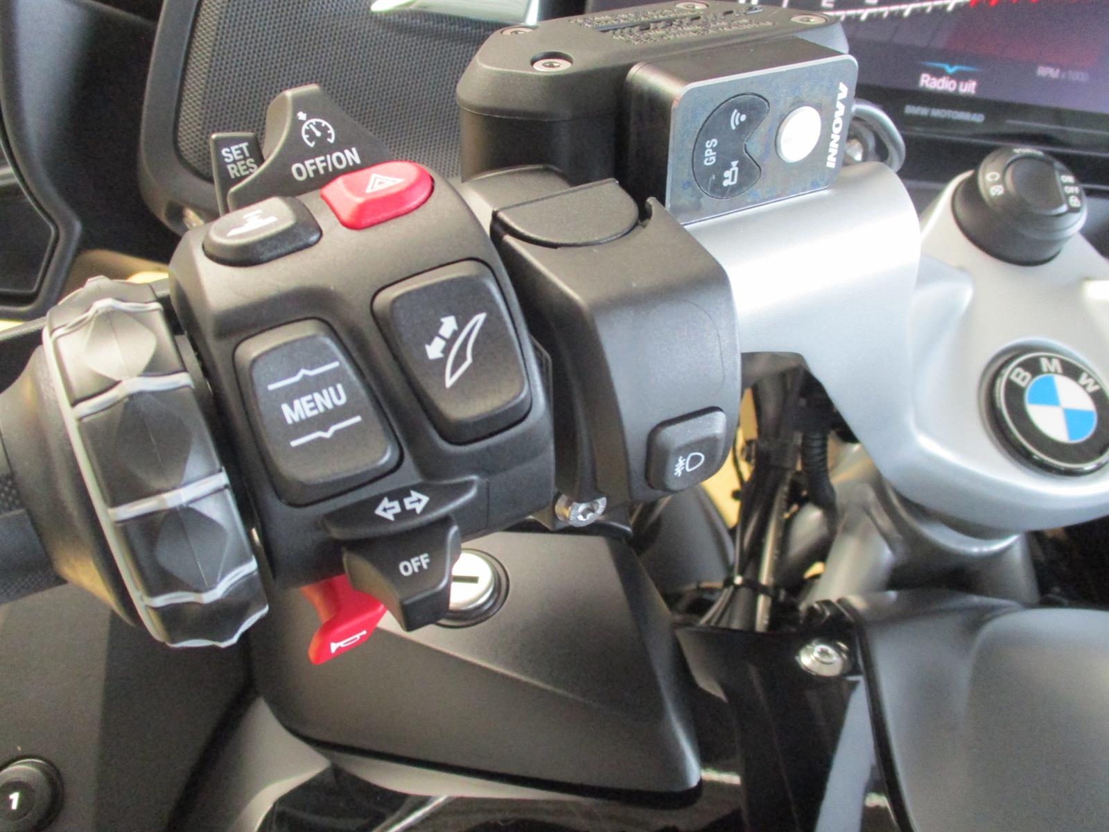 Toer topcase met extra remlicht & bagagerek, kleppendekselbescherming, stootstrips op koffer, tanktas met ring (niet gemonteerd), binnentassen, Innov8 camera